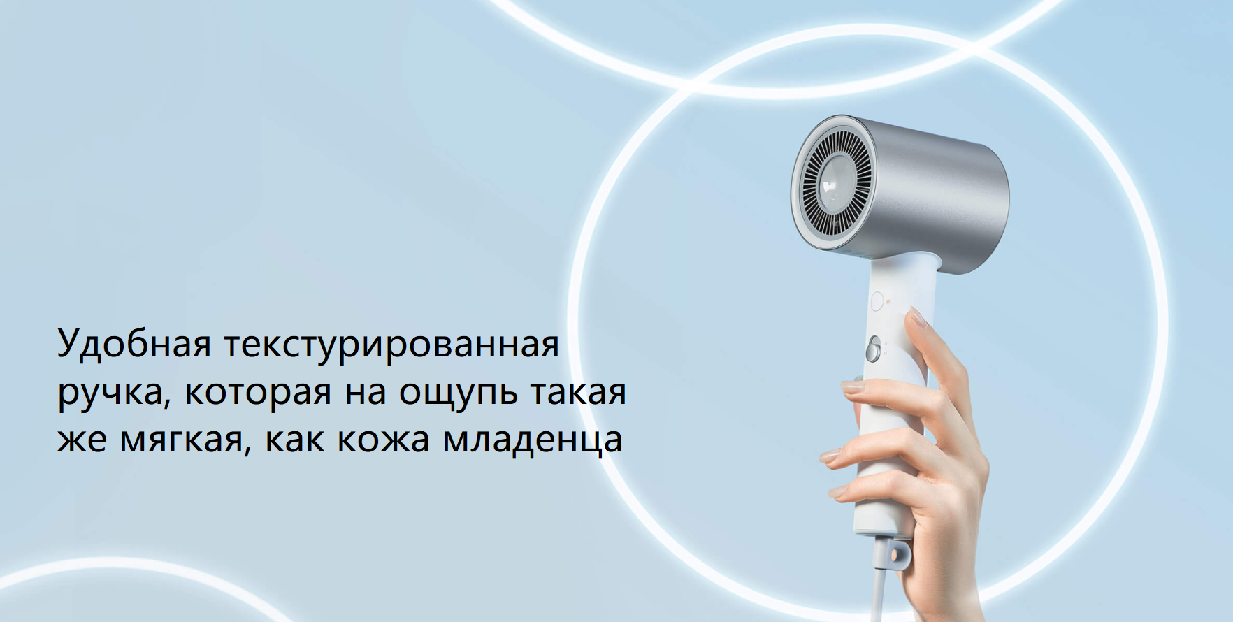 Мягкое покрытие было нанесено на ручку для более удобного захвата. Двухслойная отделка устойчива к загрязнениям и царапинам. Фен ощущается таким же гладким, как кожа, когда вы держите его в руке, и сохраняет чистый и свежий вид даже после длительного использования.