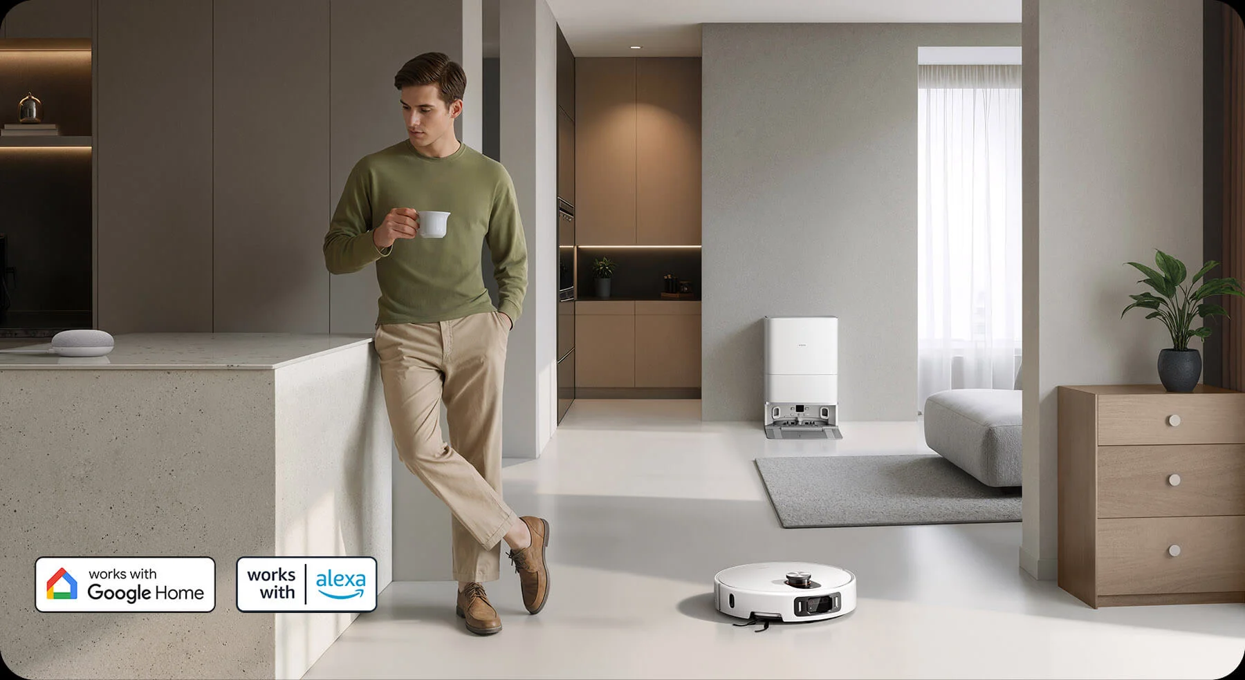 Ёмкий аккумулятор на 5200 мА·ч обеспечивает до 140 минут непрерывной работы, что эквивалентно уборке до 400 м². После завершения цикла или при низком заряде робот автоматически возвращается на станцию для подзарядки. Управление реализовано через смартфон: можно задать расписание, режим уборки, влажность подачи воды и даже включить устройство голосом — через Google Assistant или Alexa.